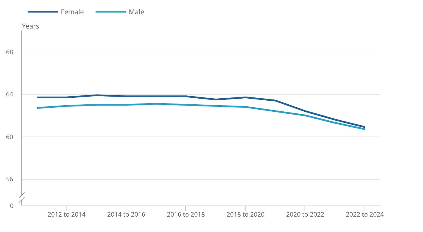 Last month, the Office for National Statistics published data showing that healthy life expectancy (years of life spent in good health) in the UK had fallen to its lowest level since records began in 2011. Men can now expect to spend 60.7 years in good health, while the average for women is ever so slightly higher at 60.9 years.
