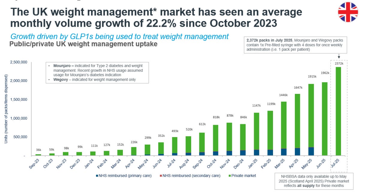And second, and more fundamentally, the inequity argument assumes there is an equitable system being undermined. Equity, in this context, would mean giving everyone who needs these drugs a genuine shot at accessing them. But the NHS isn’t currently offering GLP-1s at anything close to population-scale, because most of the people going private were never going to get these drugs through their GP in any reasonable timeframe.
