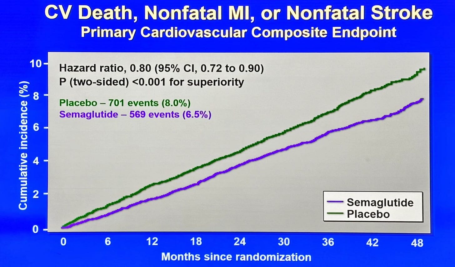 GLP-1s prevent cardiovascular events and produce significant weight loss, which independently reduces the risk of type 2 diabetes, joint disease, sleep apnoea, and several cancers. Statins, by contrast, do one thing: they lower cholesterol to reduce cardiovascular risk. GLP-1s do that and fix the underlying metabolic dysfunction driving much of modern chronic disease. So an NNT of 67 is a crude measure here, capturing only one benefit of a drug that is producing several.