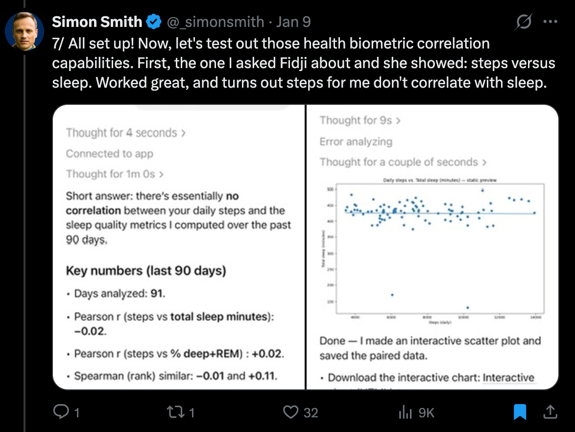 Last week, OpenAI launched ChatGPT Health. It syncs with your medical records and allows you to connect to other health and wellness apps, like Peloton and MyFitnessPal. Basically, it allows you to ask questions about your health data. For the average consumer, this is a genuinely wonderful moment and, in my view, will be the unlock millions of people need to understand what on earth is going on with their health.