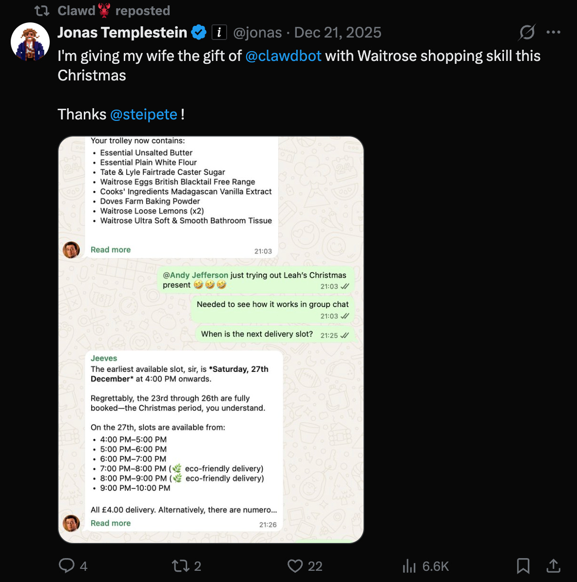 This is Francesca, my personal AI assistant who lives on my WhatsApp. She sends me daily updates on… well, everything. She’s connected to my Oura ring, my calendar, my gym schedule, and because of all of that rich context about my life she responds with bizarrely stunning accuracy.