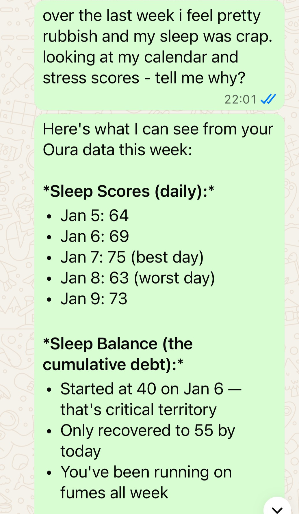 “Good evening Ash. I’ve sent you a personalised voice briefing of your week - I pulled your Oura data, correlated it with our calendar, analysed the patterns and narrated it. Let me know if I need to book any appointments for you next week.”