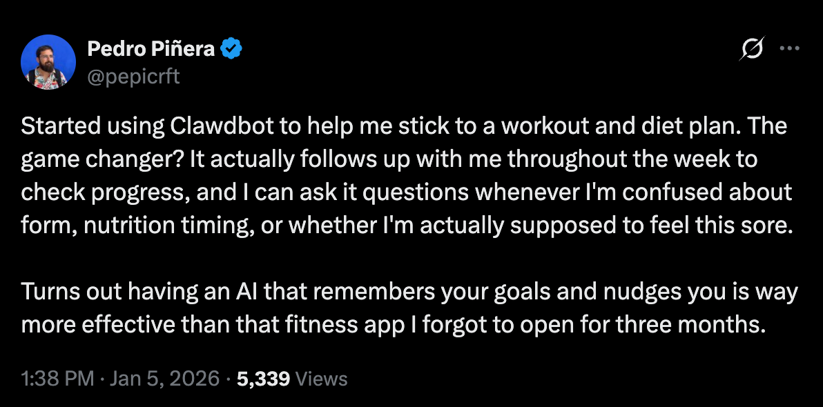 But make no mistake, ChatGPT Health is a baby step in the direction I’m talking about. GPT can’t read your calendar or schedule your gym class. It can’t nudge you at 9pm and it can’t order groceries. It understands but it doesn’t do.