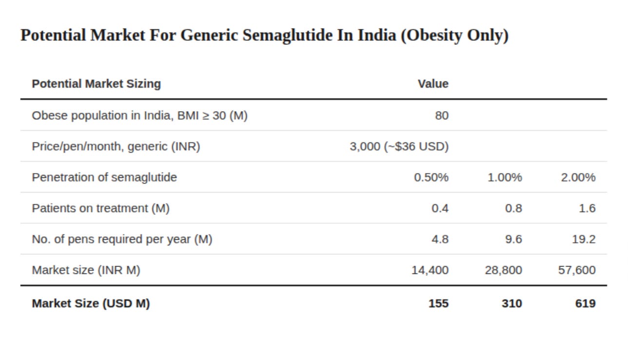On paper, I understand the appeal: 14% of the world’s obese population lives in India, and those people are mostly in the middle and upper-middle classes. There is also a growing middle class and many digitally savvy consumers who are used to paying out of pocket for healthcare. My estimates show that the obesity-only GLP-1 market could exceed $600M USD if we assume a 2% penetration rate, though it would take a few years for the market to mature.