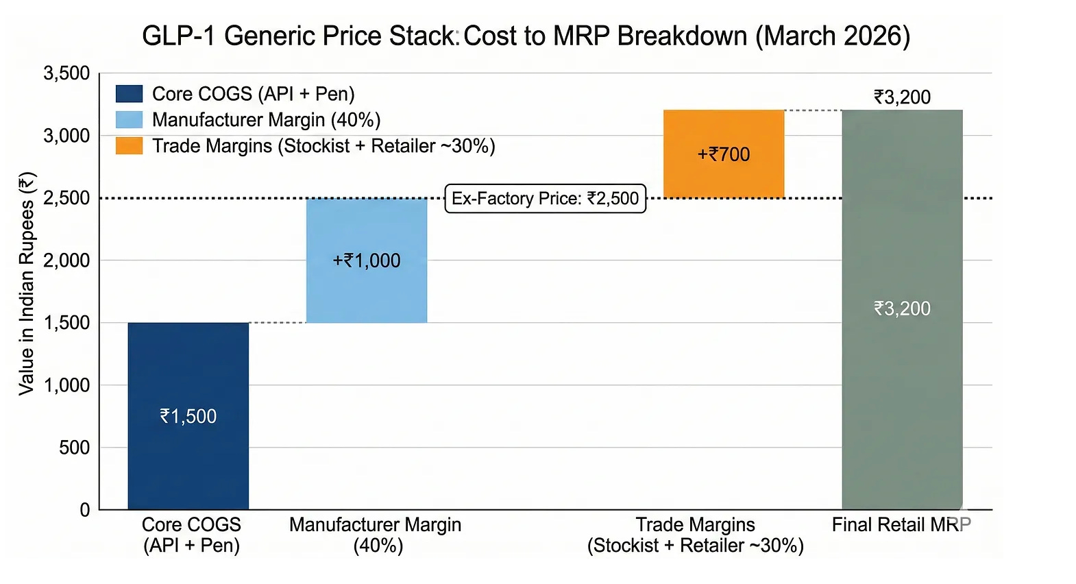 In the case of generic semaglutide, which isn’t on India’s National List of Essential Medicines, there’s no government price cap, so the manufacturer works backward from the MRP and takes their margin at the ex-factory level first. The little margin that remains is what trickles down to the wholesaler and retailer.