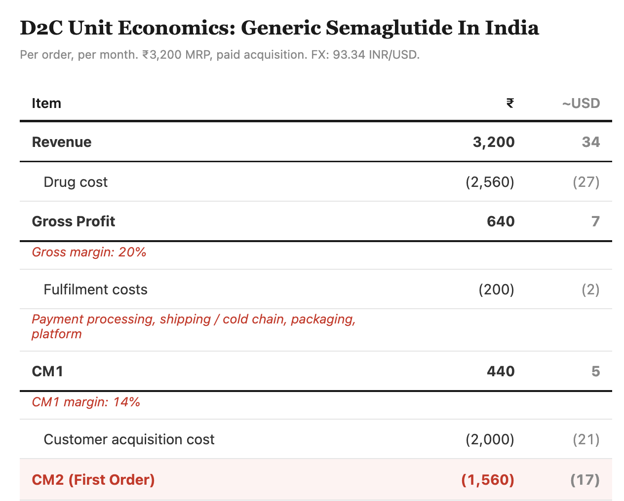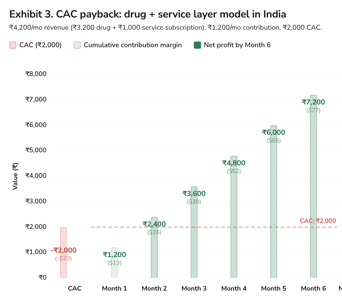 At an MRP of ₹3,200 (~$34) per month for a generic semaglutide pen, and assuming 80% of that goes to the drug cost, you’re left with ₹640 (~$4) in gross profit per order. After talking with some insiders, I estimate that for a single-category GLP-1 entrant, CAC is around ₹2,000 (~$21) per customer, which is probably on the lower side of the range.