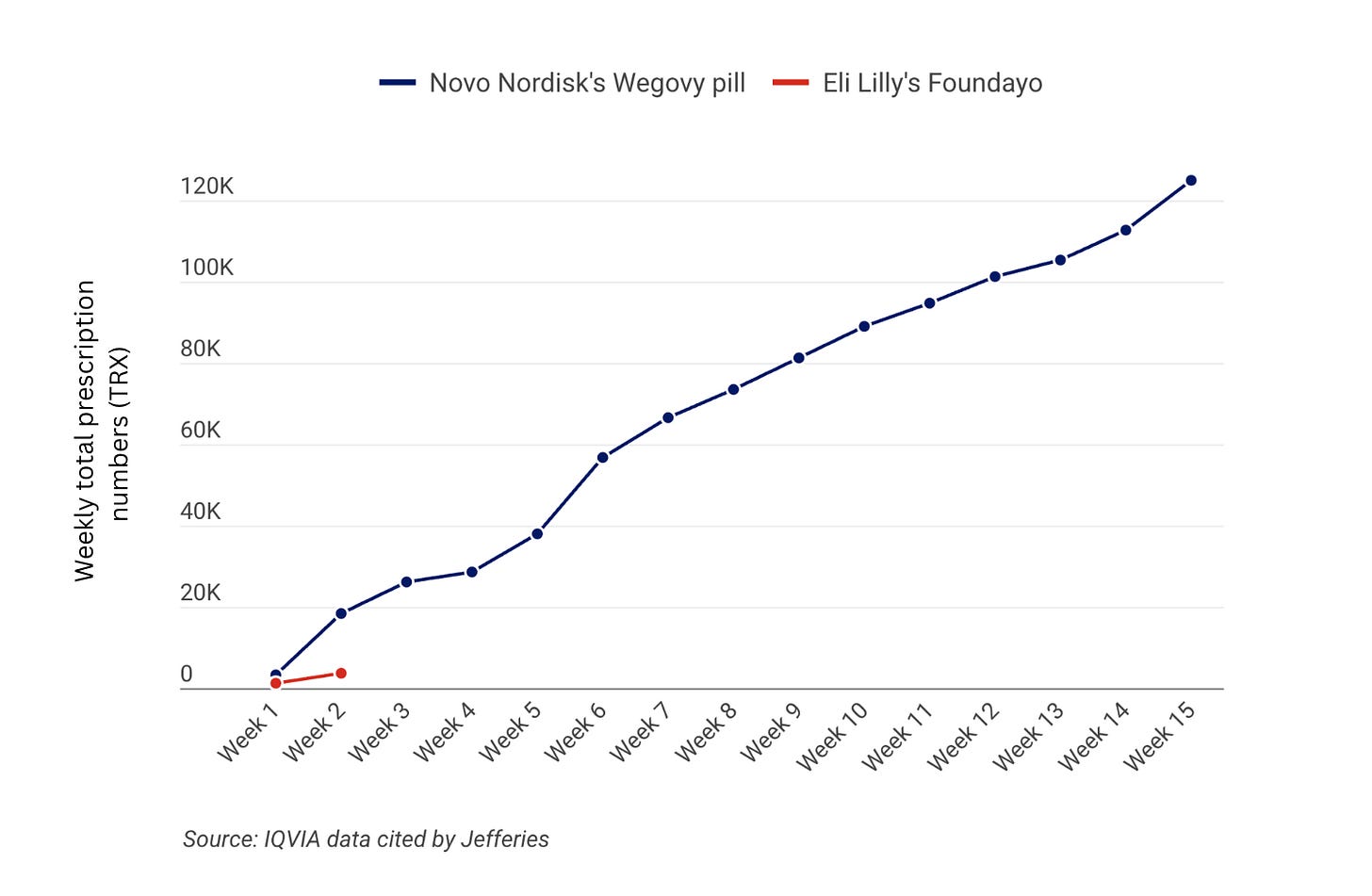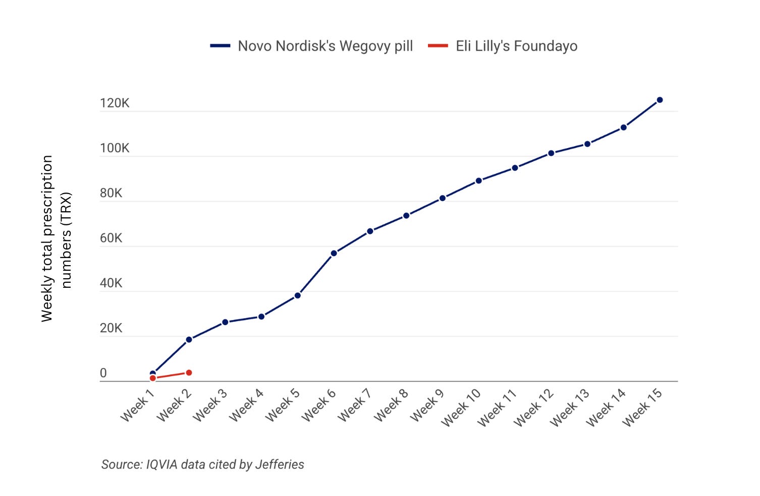 Foundayo is off to an okay-ish start with 3,707 prescriptions in its first two weeks of launch, compared to oral Wegovy’s 18,410 prescriptions.
