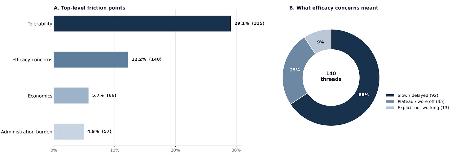 My analysis showed that roughly one in eight oral-only discussions were about efficacy concerns, and the vast majority reported slow responses to the drug or appetite/food noise coming back.