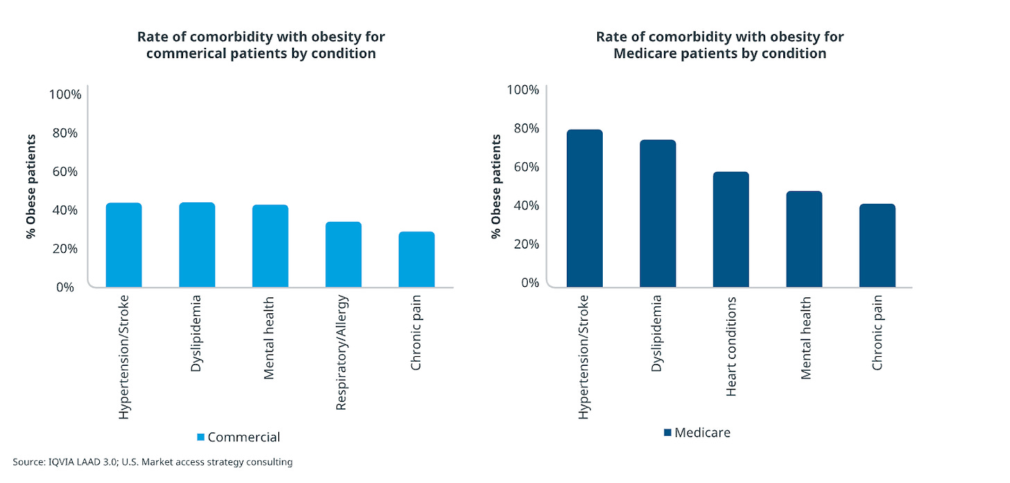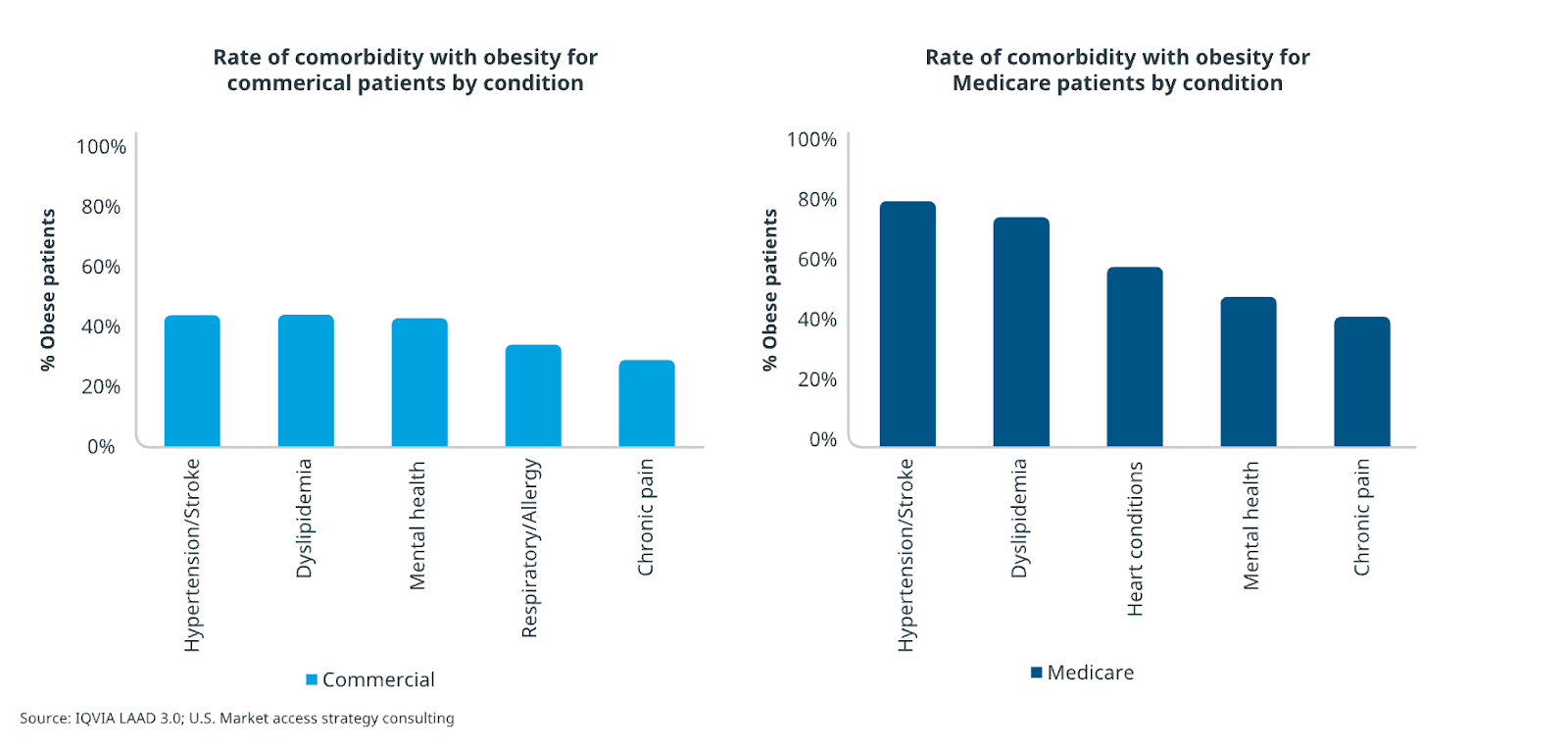 IQVIA analysis shows Medicare patients have significantly higher rates of obesity-related comorbidities compared to insured populations. Hypertension, cardiovascular disease, kidney disease, and prediabetes are extremely prevalent in the 65+ age group. This makes sense given that as patients with obesity age, their risk of accumulating chronic conditions nearly doubles by the time they reach Medicare eligibility!