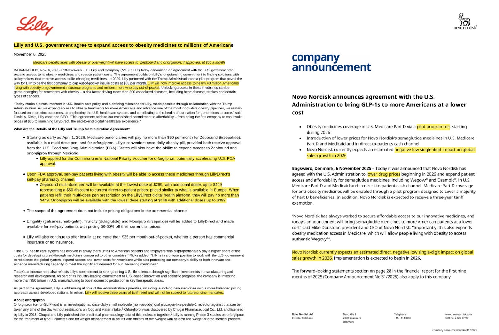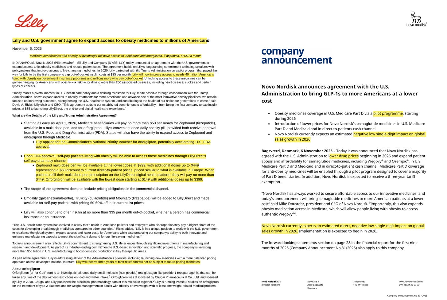 Lilly’s announcement emphasizes expanding access and “game-changing” opportunities for millions of Americans. Novo’s announcement opens by stating that they “expect an estimated negative low single-digit impact on global sales growth in 2026.”