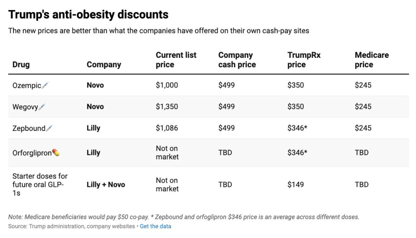 The economics of the deal are pretty sweet, too. Both Wegovy and Zepbound will cost $245/month with a $50 copay, down from current net prices of around $520-700/month.