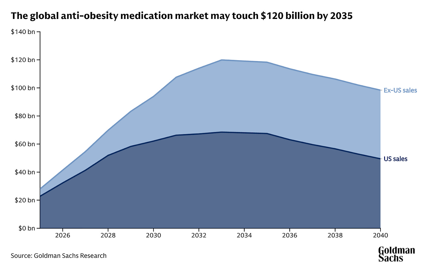 This gradual decline in net price per prescription over time means that Goldman Sachs’ analysis of their obesity market forecast was ultimately right. Price erosion will reduce the global market size of obesity by 2030 from $130 billion globally to $95 billion, with US peak sales down from $95 billion to $70 billion.