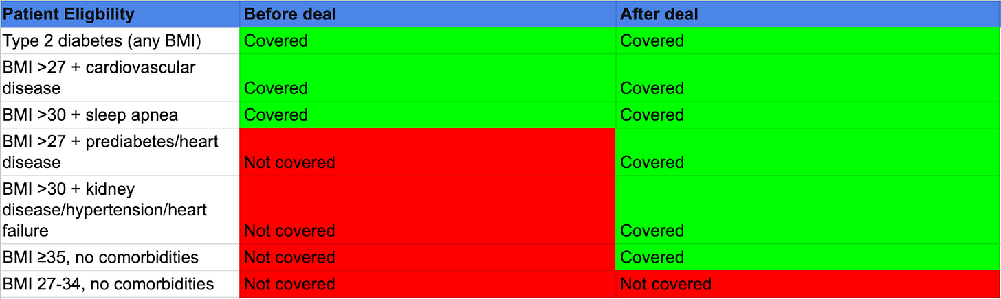 This new deal adds more comorbidities to the eligible list (prediabetes, kidney disease, heart failure, hypertension) and creates one new pathway: severe obesity (BMI ≥35) without requiring any comorbidities.