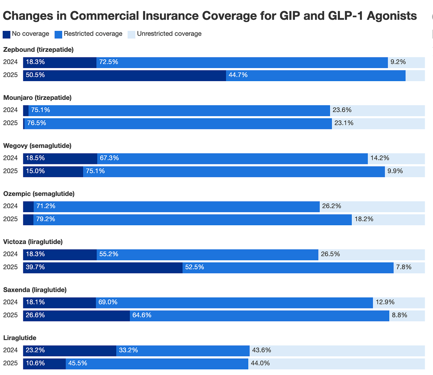 Commercial insurance has not improved in 2025 versus 2024, according to a GoodRx study based on prescription insurance coverage data. The analysis found that the number of people with no commercial insurance for Zepbound increased by 180% in 2025, with an estimated 97 million people without coverage.