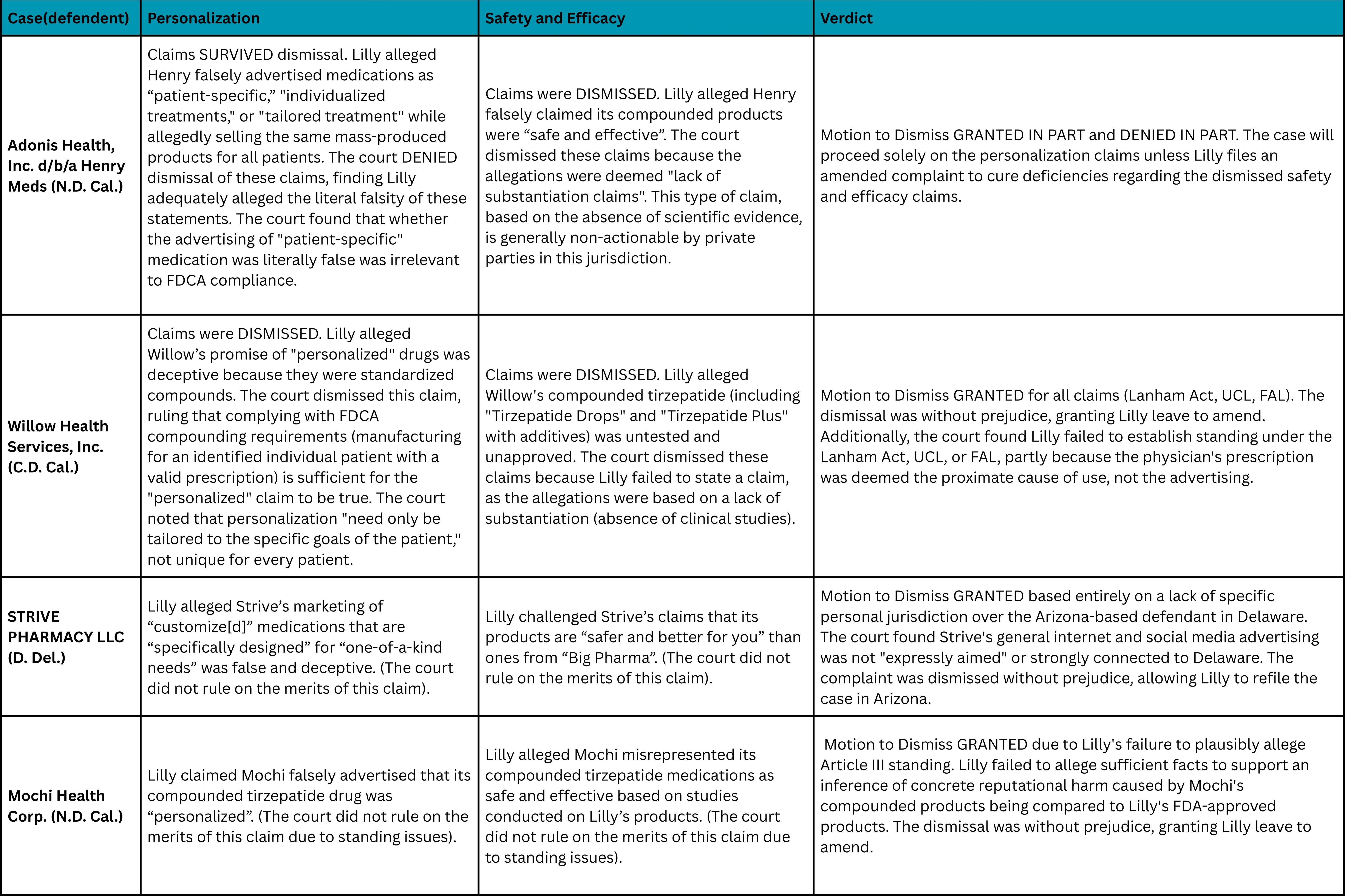 What surprised me even more was how both California courts handled safety and efficacy claims. Both dismissed them outright. Lilly argued that compounders can’t prove their products are safe because they lack FDA approval and clinical trials. The courts ruled these were impermissible “lack of substantiation” claims.