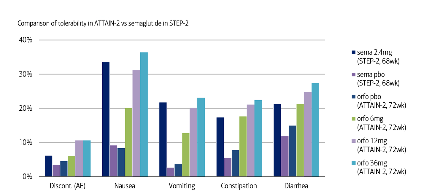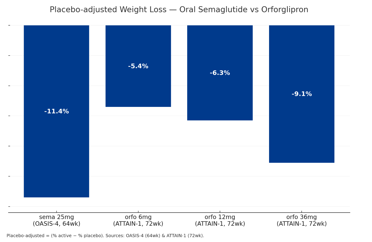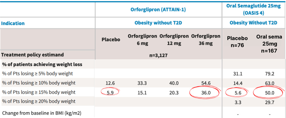 A few percentage points might not matter clinically, but they become powerful marketing tools when you're telling patients they have a 44% chance of hitting their target weight with oral sema versus 30%-ish with orforglipron—with similar side effects for both.