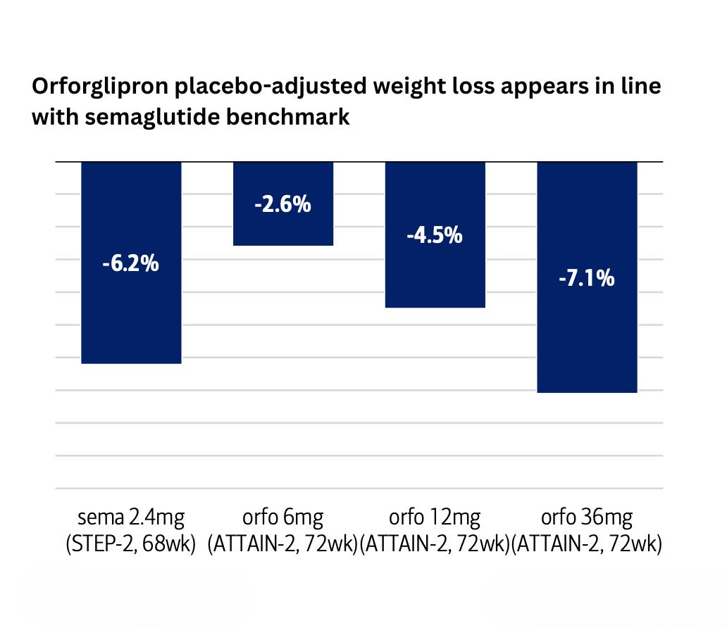 But…when you look at the ATTAIN-2 data in diabetic patients with obesity — notoriously the hardest population to treat — orforglipron produces better results, delivering 7.1% placebo-adjusted weight loss compared to injectable Wegovy's 6.2%.